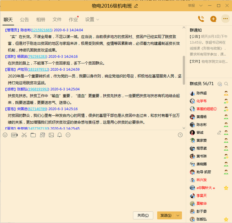 课程后半段,李超书记与全体员工进行了线上互动,加深了员工们对于课程内容的理解与认识,毕业生就如何打赢脱贫攻坚战也展开了激烈的讨论。2016级机械电子工程专业员工卢炫羽认为,2020年是脱贫攻坚的关键时期,作为一名党员应该以身作则,积极响应党的号召,投身扶贫事业,积极为基层服务。2016级电子信息工程员工张秦认为,扶贫应注重“扶志扶智”,当前“扶志扶智”工作还相对落后,所以必须补齐短板,切不可掉以轻心。