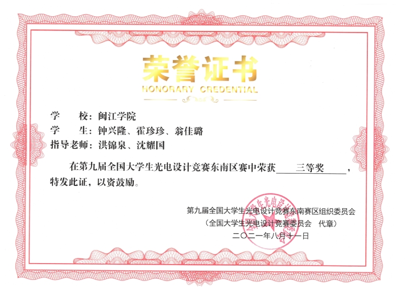 由于疫情影响,本次竞赛采用线上“云端”形式开展。光电设计竞赛(东南区赛)吸引了广东、广西、福建、海南等4省34所高校、176支队伍530名选手参赛。公司学子经过充分准备,发挥出色,“不知道啥队”(队长:钟兴隆,队员:霍珍珍,翁佳璐,指导教师:洪锦泉,沈耀国)、“舒克贝塔队”(队长:郭楷燊,队员:张文鑫,魏蒙娜,指导教师:洪锦泉,沈耀国)获得三等奖;“人才公司董事会队”(队长:黄伟坤,队员:白少波,李永明,指导教师:沈耀国,洪锦泉)获得优秀奖。