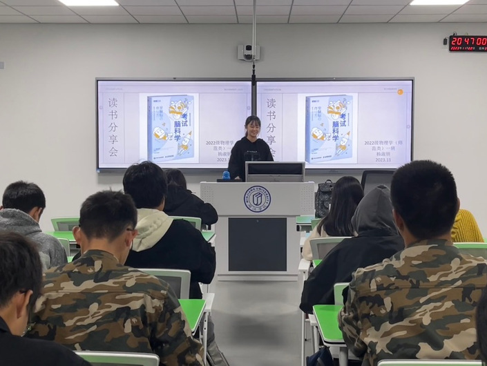 继而,杨淑妍同学重点推荐《考试脑科学》这本书。《考试脑科学》是关于“学习”与“记忆”的脑科学科普读物。可作为研究生考试、公务员考试、职业资格考试等各种考试的备考参考,也可作为日常工作、学习中的“高效记忆法”。另外,还通过集中学习和分散学习两个调查研究让同学们意识到持之以恒的重要性,与同学们分享了学习方法,对物理学专业同学今后良好学习习惯的养成有着极大的帮助,同学们纷纷表示受益匪浅,收获颇丰。