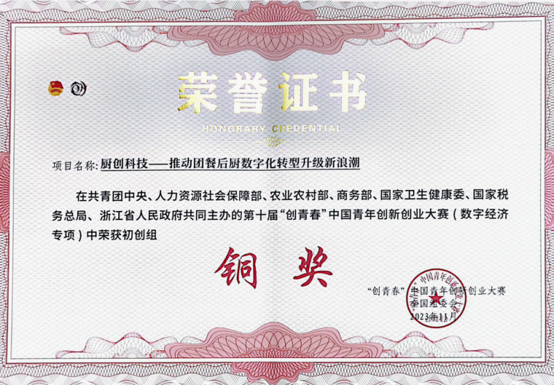 11月27日,为期3天的第十届“创青春”中国青年创新创业大赛(数字经济专项)在杭州市余杭区圆满收官,物电公司参赛项目“厨创科技—推动团餐后厨数字化转型升级新浪潮”荣获国家级铜奖。