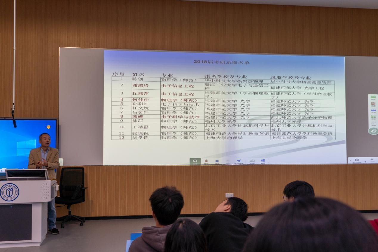 讲座中,他详细介绍了物电公司2019级电子科学与技术专业黄兴新的考研成功逆袭的经历。黄兴新录了一段视频,讲述了自己从学渣逆袭的经历,鼓励学弟学妹们要充分备考,寻求老师、学长学姐的帮助,不能孤军奋战,同时要保持良好的心态管理。