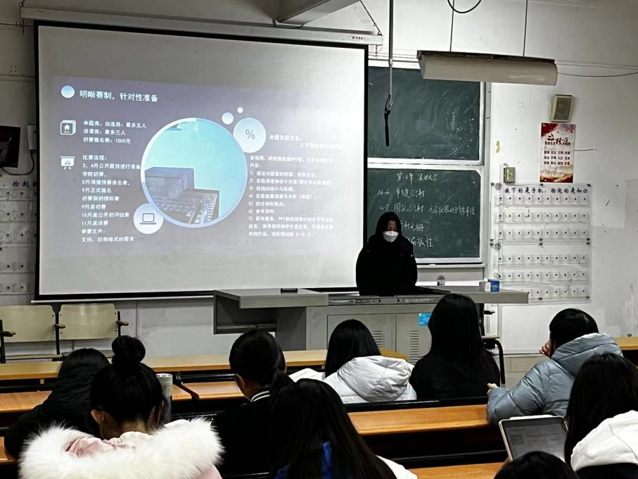 首先,由全国二等奖获奖项目成员、2020级物理学(师范)专业苏小兰同学向同学们介绍全国老员工物理实验竞赛(创新赛)概况,对比赛细则进行分析讲述,同时分享自己的备赛经验、参赛体会与心得,为同学们提供一个较为具体的备赛建议。