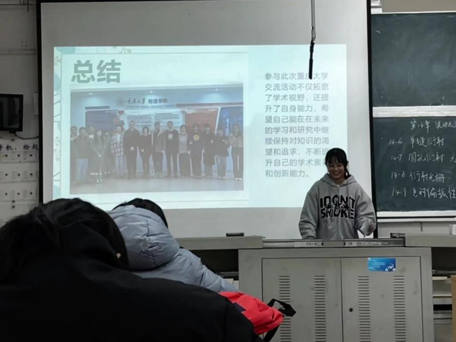 最后,由参与本次重庆大学调研活动的杨淑妍同学分享重庆大学交流心得。她为同学们介绍了在重庆大学的收获和不同的学习方法,表示在学习中过程中需要坚定目标、勤思考、重修养,为同学们的自主学习提供了新方向。