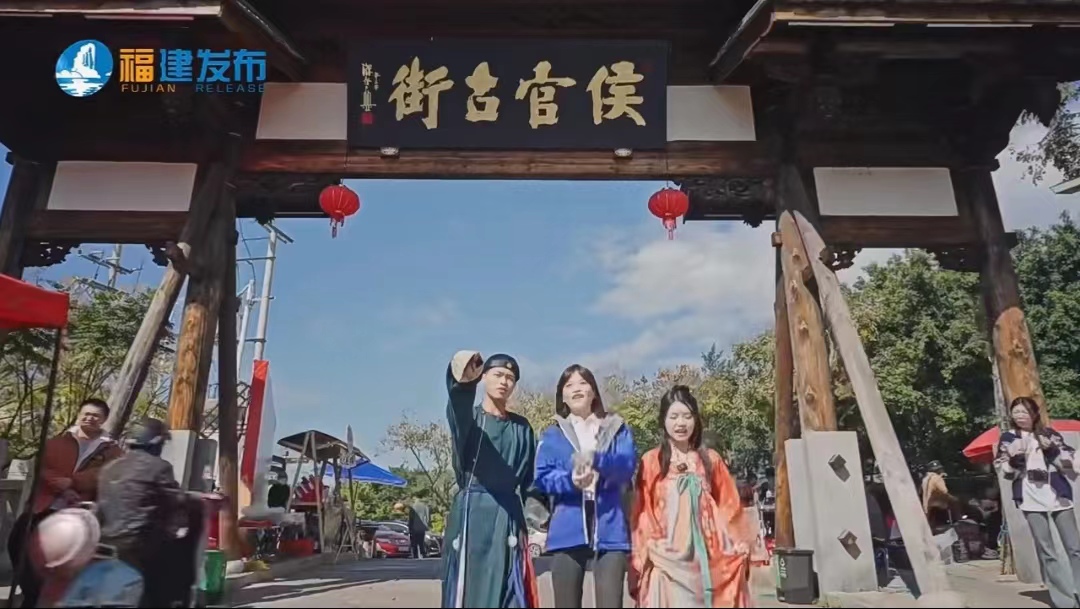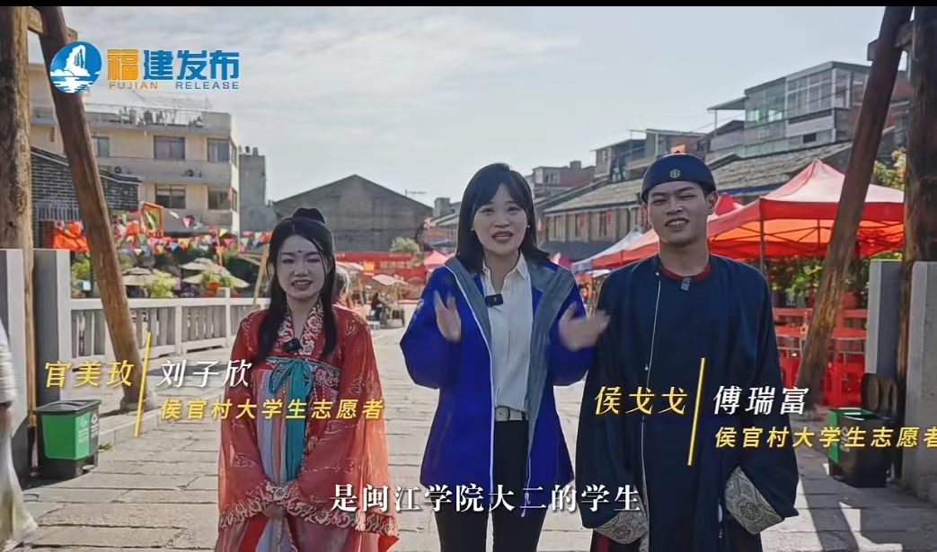 千年候官,文脉悠长。在实践调研过程中,两名队员穿上古装,打扮成侯官村IP人物形象“侯戈戈”和“官美玫”,以生动形象的演绎和解说,为侯官村拍摄宣传视频,推广候官特色文化和当地产业。极具特色的人物形象也吸引到了前来侯官村拍摄的福建省广播电视台记者,在深入沟通后,实践队成员受邀参与了福建广播电视台的拍摄录制,记者和“侯戈戈”、“官美玫”一起走进候官村,品美食,赏美景,传播候官古文化。