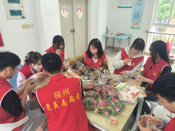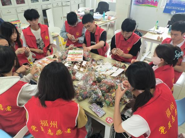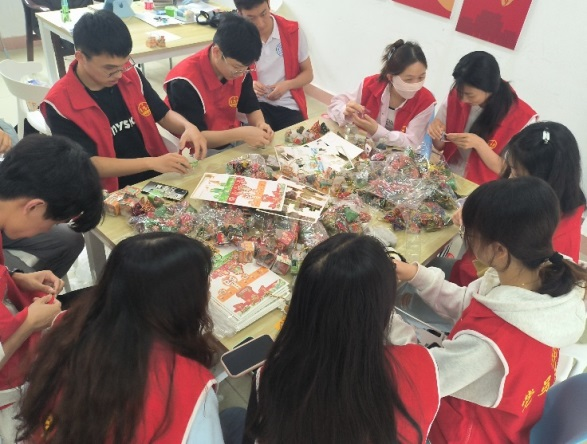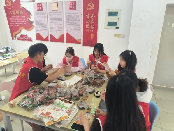 活动准备阶段,党员志愿者们早早到达活动地点,为活动开展做好充足准备。活动一开始,大家立刻就忙碌了起来,细心组装着端午香囊。分工明确,思路清晰,工作有条不紊的进行着。在共同协作下,众多寄托着美好祝愿的香囊很快就组装完成。