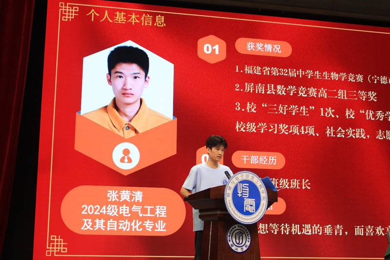 2024级电气工程及其自动化专业张黄清同学作为新生代表上台发言。他期待和同学们在闽院这个新起点,能够收获知识和技能,学会如何成为一个更加优秀的人,一个对社会有用的人。他表示将牢记校训“ 崇尚完美,追求卓越”,积极践行 “博学笃行,诚实厚重”的学风,在学术上精雕细琢,精益求精,积极参加科研项目和创新竞赛,不断提升自己的专业素养和创新能力。