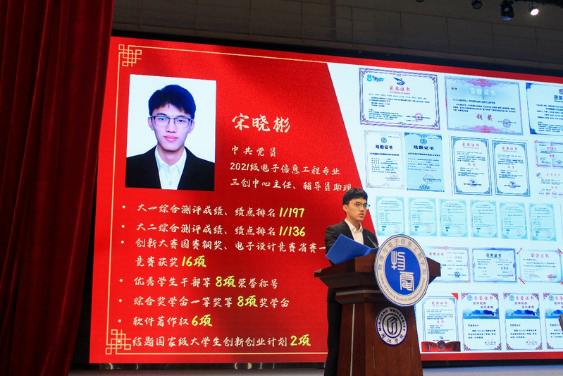 “人生万事须自为,跬步江山即寥廓。”老生代表、2021级电子信息工程专业的宋晓彬从自身经历出发,向学弟学妹们提出建议:第一:学而时习,笃行致远; 第二:知行合一,百折不挠;第三:全面发展,勇于担当。