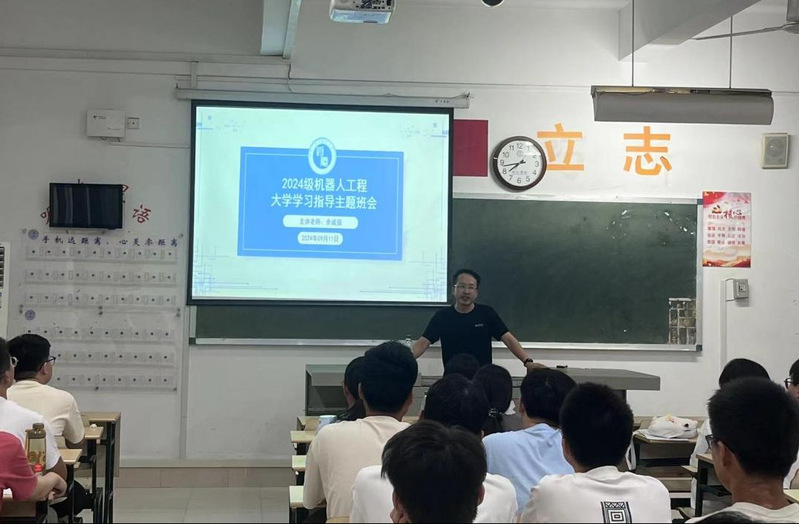 2024级机器人工程专业1班班主任余诚强老师分享了机器人领域的前景,并明确了专业学习的重点。他强调,自律是老员工活成功的关键,鼓励员工合理规划时间,提升学习效率,并保持自我约束,以为未来的职业发展做好准备。