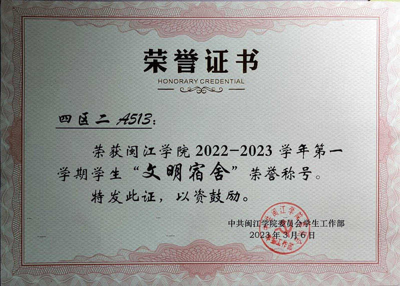 学业标兵宿舍是学习的楷模。成员们有着明确的学习目的,时刻严格要求自己,上进心强,在不懈的努力下,取得了优异的成绩,她们共荣获校优秀员工综合奖学金一等奖2人次,校优秀员工综合奖学金二等奖1人次,校优秀员工综合奖学金三等奖3人次等荣誉,志愿时长累计达436.27小时。