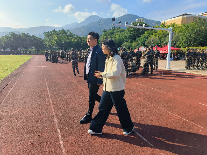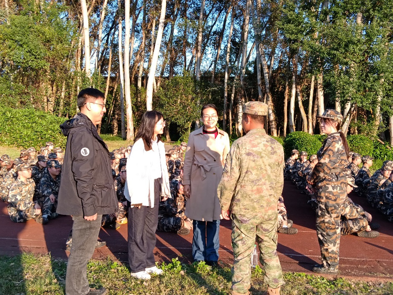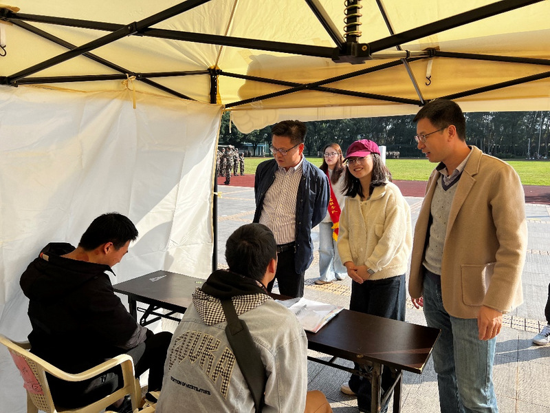 11月22日,陈世文书记和副经理刘志群前往新生军训训练场,实地了解军训进展。陈世文书记首先走进新生军训大本营,耐心询问因身体原因申请免训同学的情况,叮嘱他们注意健康,鼓励他们用积极的心态参与集体活动。