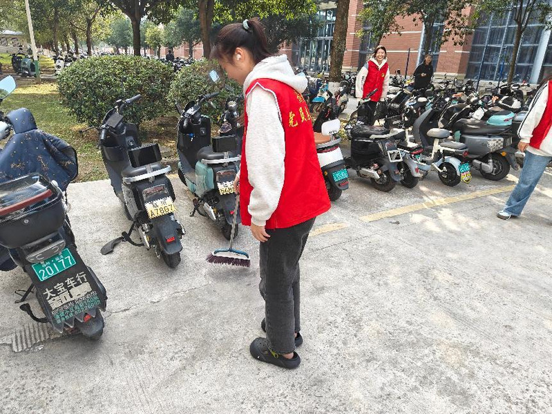 在求实社区3号楼,志愿者们帮助规范电动车停放在规定区域内,认真清扫地面,擦拭桌椅,将宿舍大堂变得整洁干净。党员志愿者们携带垃圾袋、手套等工具,打扫草坪清扫垃圾,对打扫的垃圾进行垃圾分类,用实际行动践行党员的先锋模范作用。