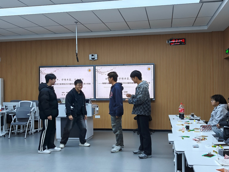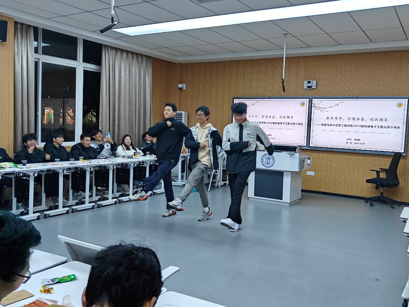 时光如梭,岁月如歌。当2024年的脚步渐行渐远,2025年的新篇章悄然开启。为总结入学以来的成长历程,缓解期末备考的压力,并为同学们送上元旦祝福, 12月26日,物电公司2024级机械电子工程班举办了以“新岁序开,学绩共鉴,迎战期末”为主题的迎元旦班会。此次班会总结过往,展望未来,2024级新生辅导员白洁玉应邀出席,全班同学热情参与,共享温馨时光。