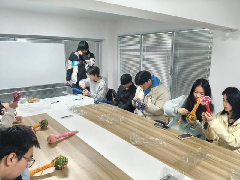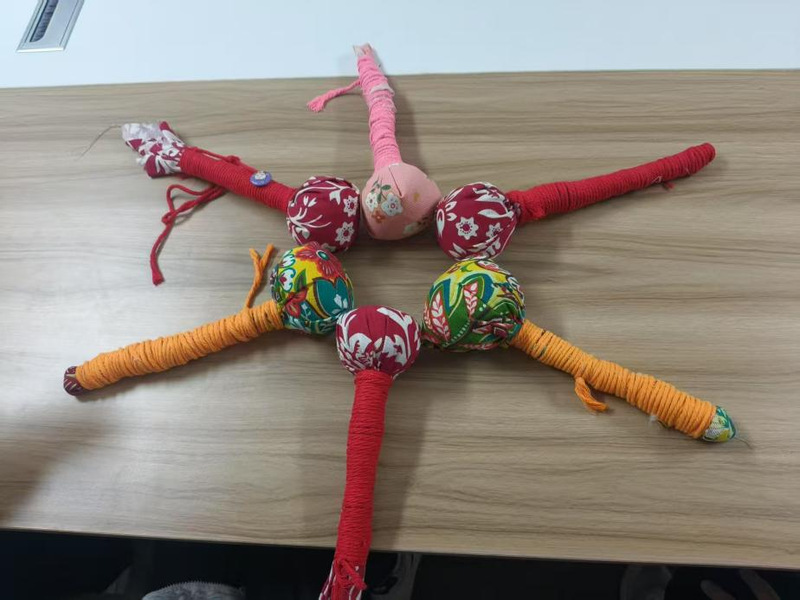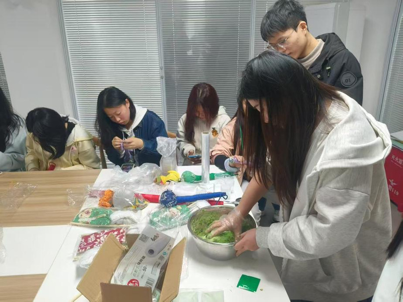 活动现场弥漫着艾草特有的清香,首先通过多媒体影像重现《清嘉录》记载的虎形艾锤制作场景。员工们在指导下将艾叶、桂枝等中药材装入粗麻布袋,运用十字缠绕法固定木柄,最终制成兼具养生功能与文化寓意的艾草锤。每一道捆扎工序都需控制力度,这让我体会到传统手作的匠心理念。2023级物理学(师范类)专业郭梓杰同学展示作品时说道。
