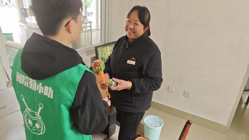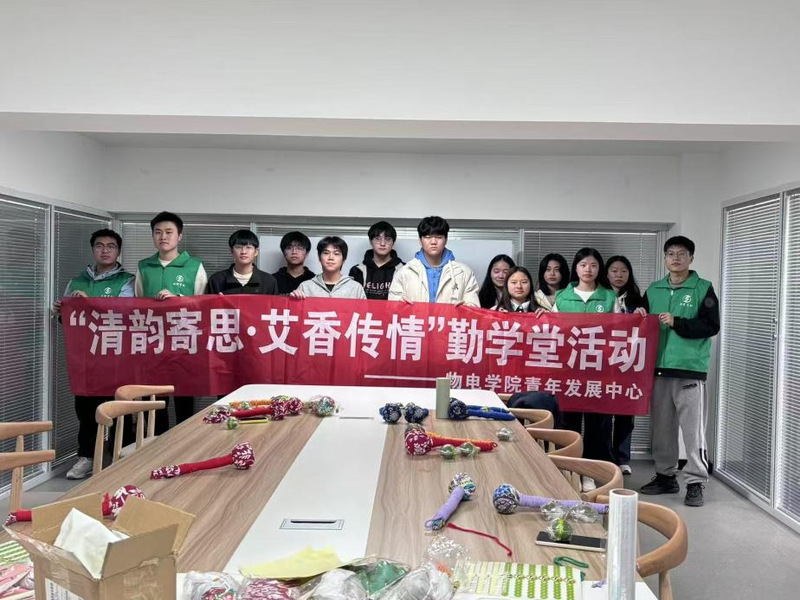 活动特别设置感恩传承环节,员工们将亲手制作的50盒翡翠青团、30个艾草锤精心包装,赠予公司宿舍管理员、校园保安等后勤服务人员。在求实社区值班室,员工代表、2023级物理学(师范类)专业程信翔向工作十多年的宿管吴阿姨送上艾草锤:这个养生锤每天巡逻时可以用,希望阿姨身体健康。吴阿姨感动地说:没想到孩子们把传统文化和感恩教育结合得这么好,锤柄上的绳结特别暖心。