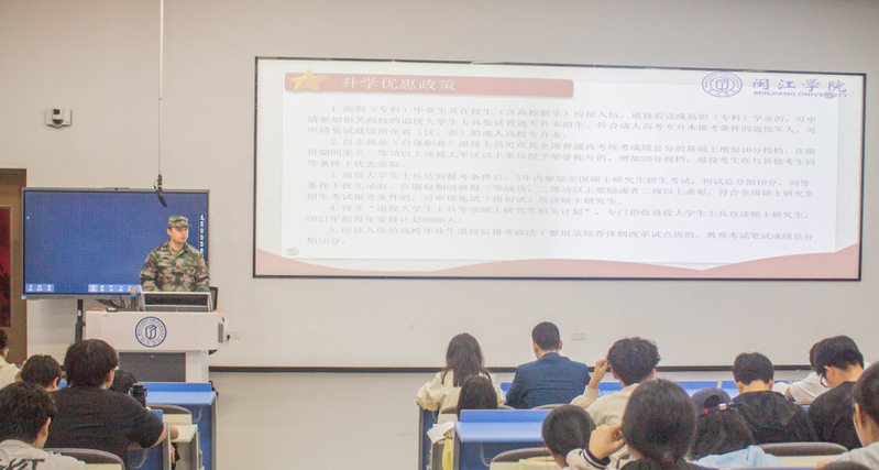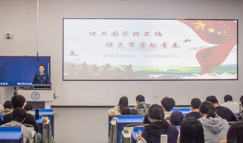 在宣讲环节,林屹峰学长围绕应征入伍的基本条件、报名流程及各项优惠政策,作了详细解读。他重点介绍了参军的年龄、身体、政治要求,细致讲述了网上报名、初检初审等关键步骤,同时深入分析了学费补偿、部队选拔、复学升学等政策利好。林屹峰鼓励同学们以青春之我投身军营,以实际行动书写报国华章。