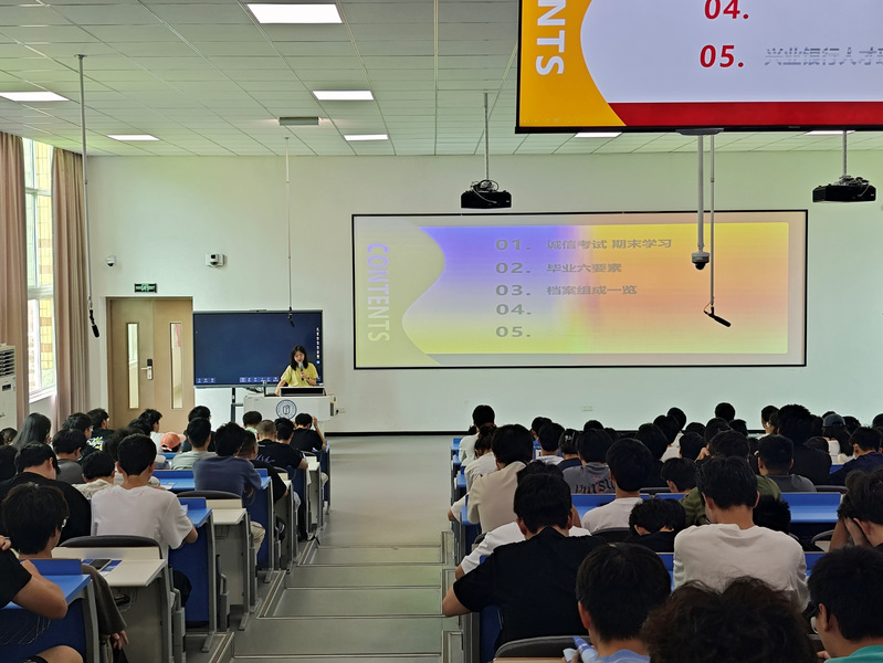 针对毕业核心要素,她重点讲解学分修读、第二课堂、公共选修、体质测试等关键指标,提醒同学们及时核对成绩、梳理学业进度,防范潜在风险。她还鼓励同学们主动参与学科竞赛、社会实践、体艺活动等项目,丰富自身档案,提升综合素质。暑期管理上明确了留校审批流程与安全注意事项,倡导大家用好暑期“窗口期”做到实践锻炼与自身提升相结合。