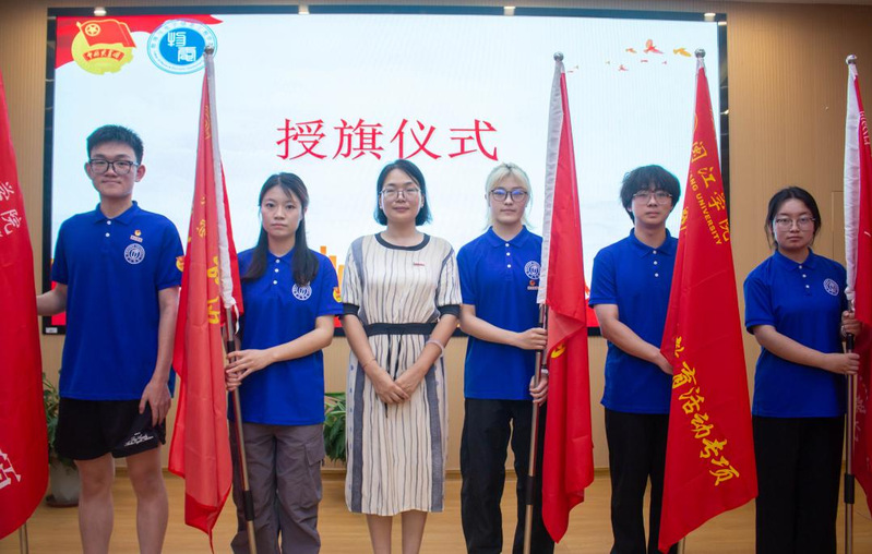 教师代表白洁玉老师则以“安全、协作、成长”为关键词,为队员们送上嘱托:“实践是最好的课堂,希望同学们在探索中增长才干,指导老师们永远是大家坚实的后盾。”随后,张林雯副书记为实践队伍授旗,鲜红的旗帜随风飘扬,点燃全场热血。