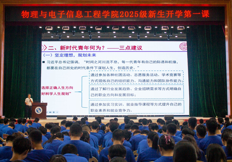 英文PPT、双语授课,刘中经理的“开学第一课”,令新生们印象深刻。他聚焦公司名称“物理与电子信息工程”展开深度解读,从学科发展脉络与办学定位出发,阐释名称的由来与内涵,帮助学子们精准把握公司学科特色。同时,他讲解公司未来发展规划,为学子们的专业学习与职业规划提供清晰指引,让大家在了解公司发展蓝图的过程中,更加热爱所学专业。
