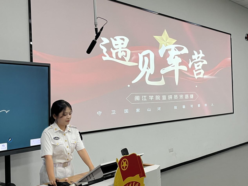 随后,主讲人宋语捷同学以“遇见军营”为主题,结合自身军旅经历展开分享。她用生动的语言、鲜活的案例,从入伍动机、军营日常训练、执行任务经历到退伍后的成长蜕变,全方位展现了军营生活的点点滴滴。她还分享了自己在部队中学会的责任担当、团队协作精神,让在场新生对军营生活有了更直观、更深刻的认识。