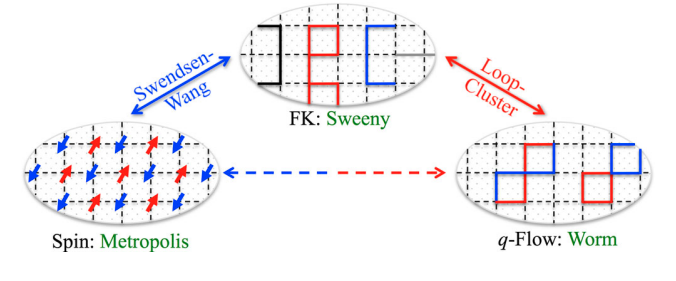 Potts自旋系统在统计力学和量子场论中起着基础性的重要作用,该理论可以使用自旋、Fortuin–Kasteleyn(FK)键或Q环路进行表示。邓友金教授团队引入了一个键占据变量相互作用的环簇(LC)联合模型,并提出一个与著名的Swendsen-Wang算法具有相同动力学普遍性的LC计算方法。该种计算方法既能完成所有表示的理论统一,又能在数值上实现在一个表示中应用最有效的算法,同时在其他表示中测量物理量。