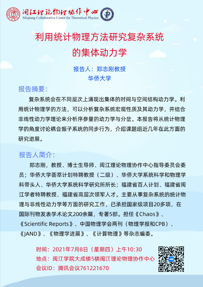 闽江理论物理协作中心邀请华侨大学郑志刚教授前来学术交流并做报告。
