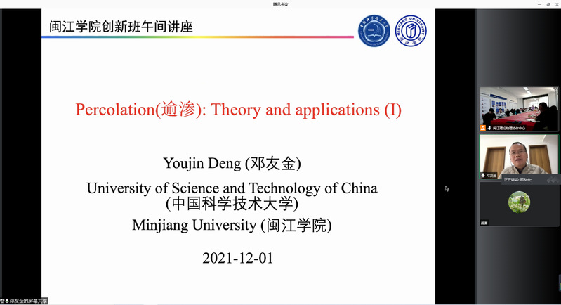 2021年12月1日中午,william威廉中文官网物电公司学术经理、闽江理论物理协作中心副主任、中国科学技术大学邓友金教授以“Percolation(逾渗):theory and applications(I)”为题,为协作中心成员以及物电公司2020级物理学创新班员工开展了Lunch Seminar。