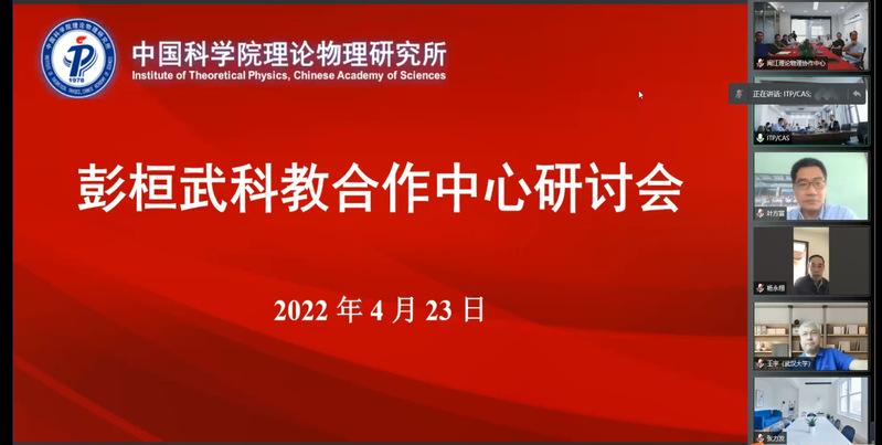 4月23日,中科院理论物理研究所组织召开彭桓武科教合作中心研讨会。本次研讨会采用线上形式进行。闽江理论物理协作中心作为中科院理论物理研究所开拓的创新平台与北京航空航天大学、国科温州研究院、湖南师范大学、东北大学、兰州大学、山东大学、重庆大学、南京师范大学、广西师范大学、华中师范大学、武汉大学的科研机构的领导、专家同时在线参与了本次会议。会议由中科院理论物理研究所周善贵副所长主持。