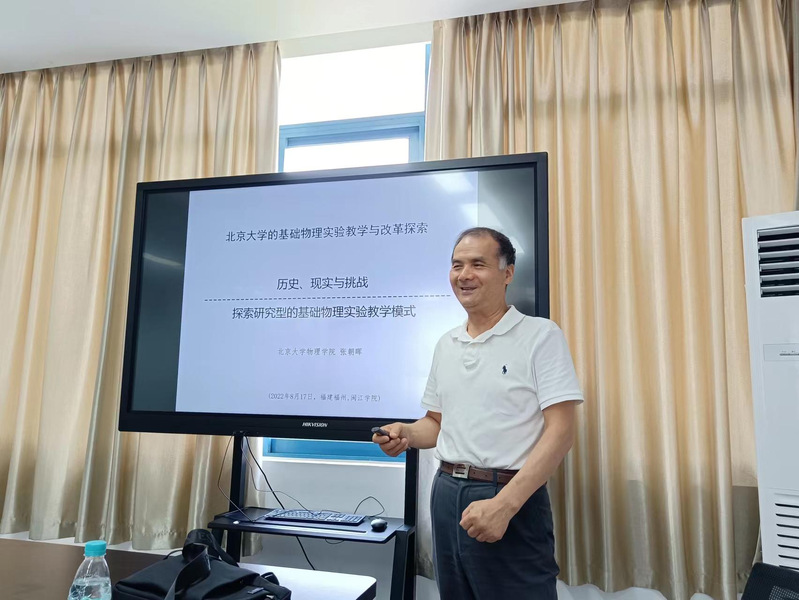 2022年817午,北京大学物理公司教授张朝晖“北京大学的基础物理实验教学与改革探索”为题,在闽江理论物理协作中心会议室为中心成员及物电公司师生作了学术报告。报告由协作中心执行主任熊大兴教授主持。