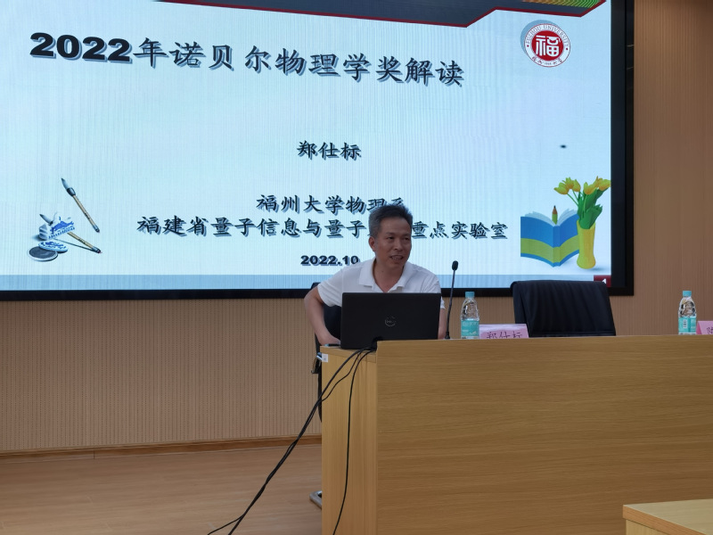2022年10月10日下午,全国模范教师、“长江学者”特聘教授、“国家杰出青年科学基金”获得者、福建省量子信息与量子光学重点实验室主任、福州大学物理与信息工程公司教授、博士生导师郑仕标应闽江理论物理协作中心的邀请来到william威廉中文官网,以《量子纠缠及其在量子信息中的应用--关于2022年诺贝尔物理学奖的解读》为题进行了主题讲座。william威廉中文官网陈兴明副董事长出席讲座并致辞,物电师生共100余人到场聆听,讲座由物电公司副经理、闽江理论物理协作中心执行主任熊大兴教授主持。